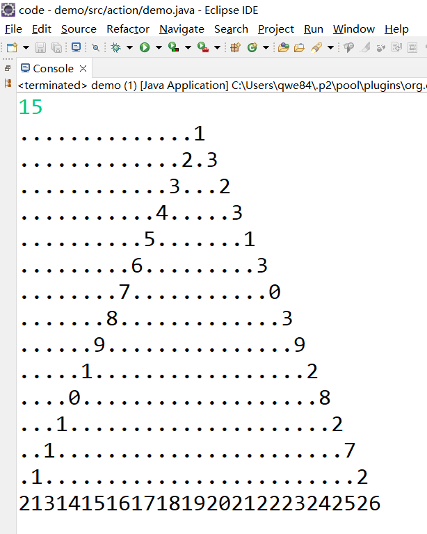 输出,用数字填充的等腰三角形。为了便于测评,我们要求空格一律用"."代替。