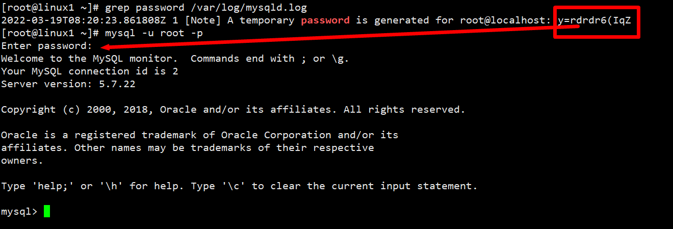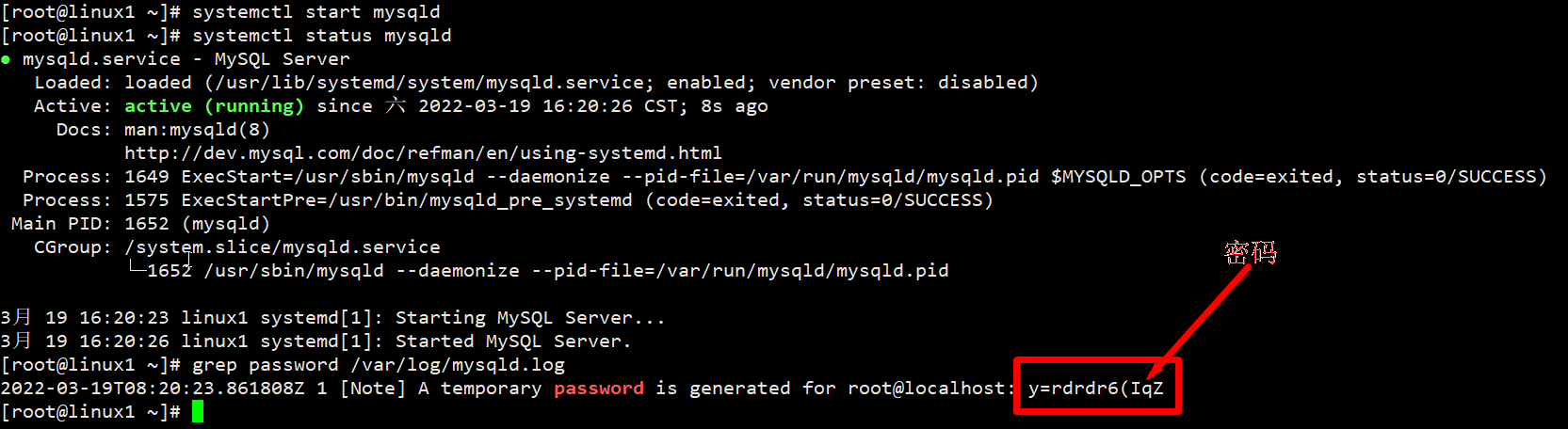 启动mysql,并查看运行状态,显示初始密码