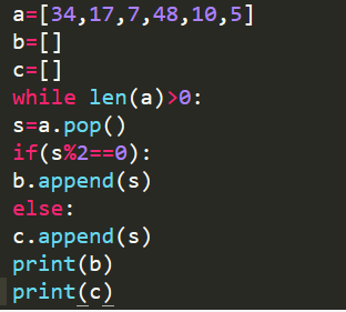所以开始的时候从a列表中弹出对应的值,然后b列表保留的是偶数值,c列表保留的是奇数值;a弹出的第一个数是5,所以放在c列表第一个;a弹出的第二个数是10,所以放在b列表第一个ÿ