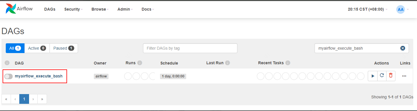 “ps aux|grep webserver”和“ps aux|grep scheduler”找到对应的airflow进程杀掉,重新启动Airflow。重启之后,可以在airflow webui看到对应的DAG ID ”myairflow_execute_bash”。