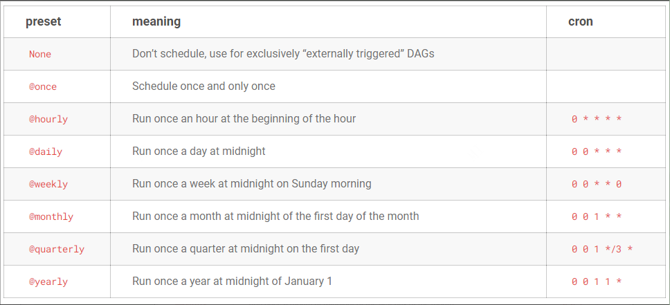 schedule_interval = '@daily' # 使用预置的Cron调度,每天0点0分调度