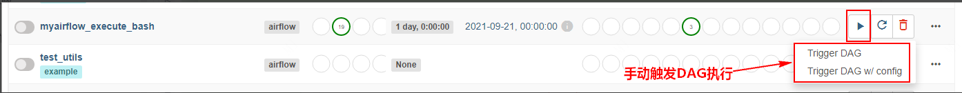 按照如下步骤执行DAG,首先打开工作流,然后“Trigger DAG”执行,随后可以看到任务执行成功。