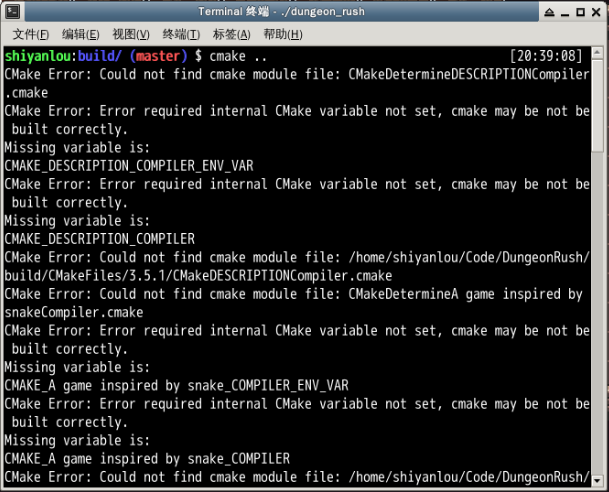 CMake Error: Could not find cmake module file: /home/shiyanlou/Code/DungeonRush/build/CMakeFiles/3.5.1/CMakeA game inspired by snakeCompiler.cmake
