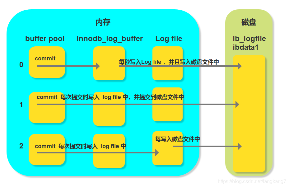 0:log buffer将每秒一次地写入log file中,并且log file的flush(刷到磁盘)操作同时进行。该模式下在事务提交的时候,不会主动触发写入磁盘的操作。