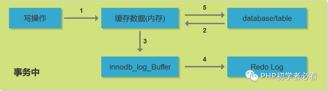 当我们在一个事务中尝试对数据进行写时,它会先将数据从磁盘读入内存,并更新内存中缓存的数据,然后生成一条重做日志并写入重做日志缓存,当事务真正提交时,MySQL 会将重做日志缓存中的内容刷新到重做日志文件,再将内存中的数据更新到磁盘上,图中的第 4、5 步就是在事务提交时执行的。