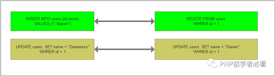 在日志文件中,在事物中使用的每一条insert都对应了一条delete,没一条uodate也都对应一条相反的update语句