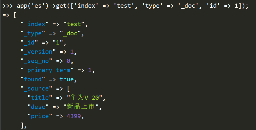 app(‘es’)->get([‘index’ => ‘test’, ‘type’ => ‘_doc’, ‘id’ => 1]);