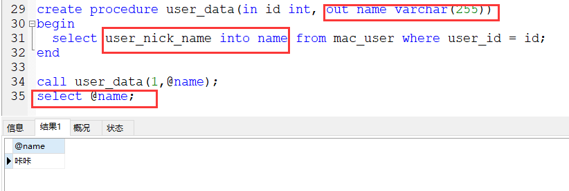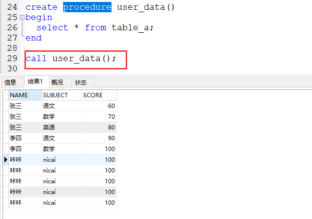 在上边创建存储过程中,我们知道在user_data()里边可以携带参数的