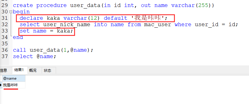 declare kaka varchar(225) default ‘我是咔咔’;