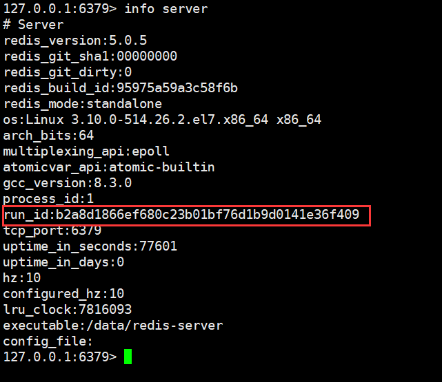 每个Redis节点(无论主从),在启动时都会自动生成一个随机ID(每次启动都不一样),由40个随机的十六进制字符串组成,runid用来唯一识别一个Redis节点。通过info server命令,可以查看runid