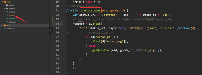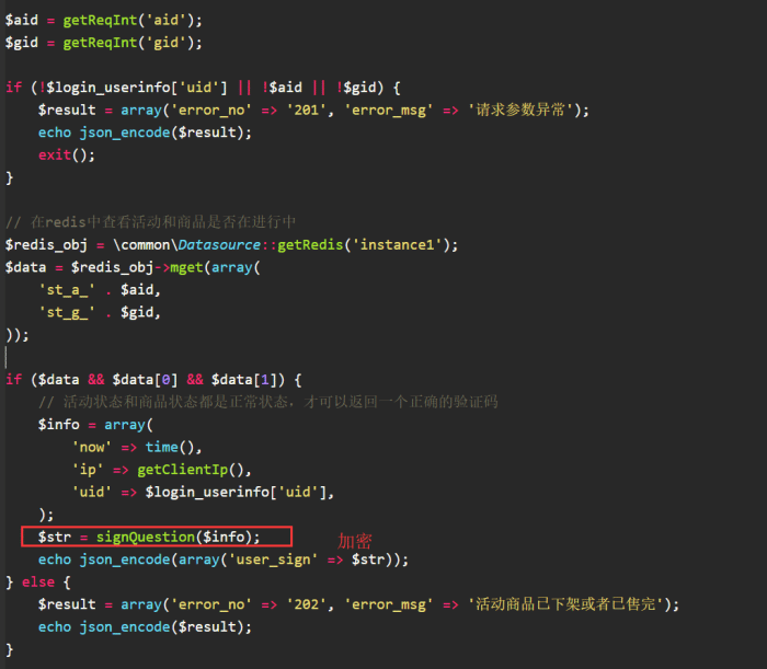 4. 在动态文件中会对活动状态和商品状态进行判断,验证。最后返回一个加密的信息给前端,然后前端拿着这个加密的串码进行请求buy.php秒杀接口