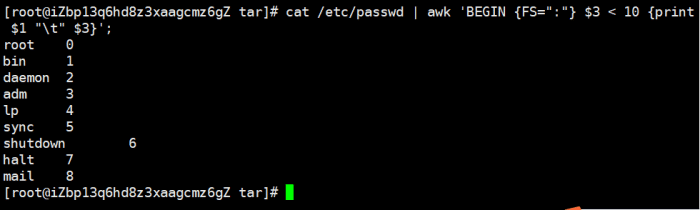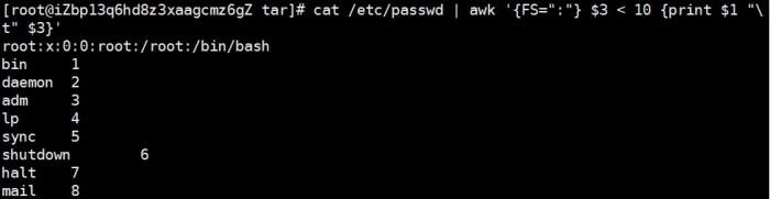cat /etc/passwd | awk 'BEGIN {FS=":"} $3 < 10 {print $1 "\t" $3}';