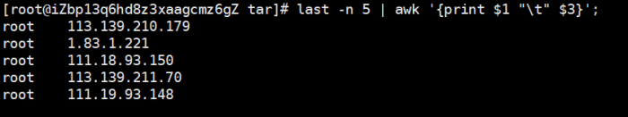 last -n 5 | awk '{printf $1 "\t" $3}';