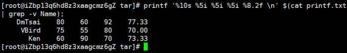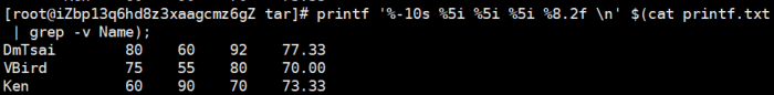 printf '%10s %5i %5i %5i %8.2f \n' $(cat printf.txt | grep -v Name);