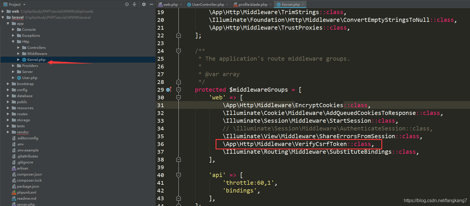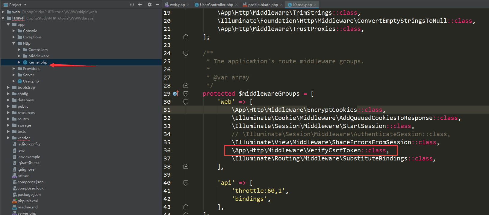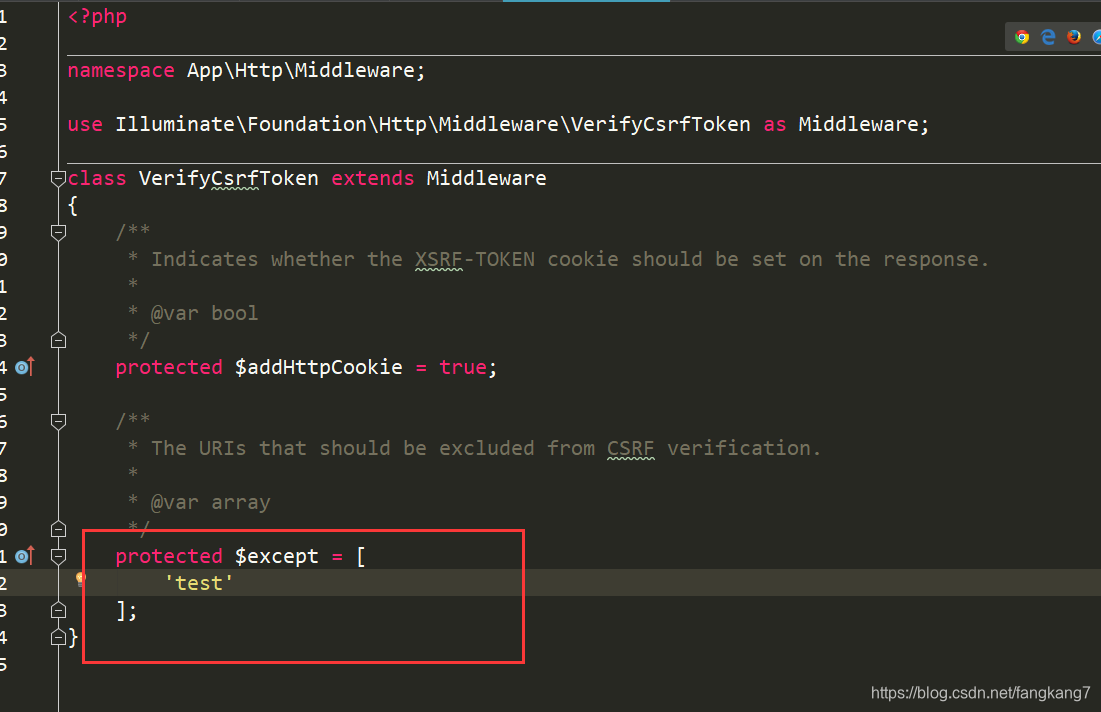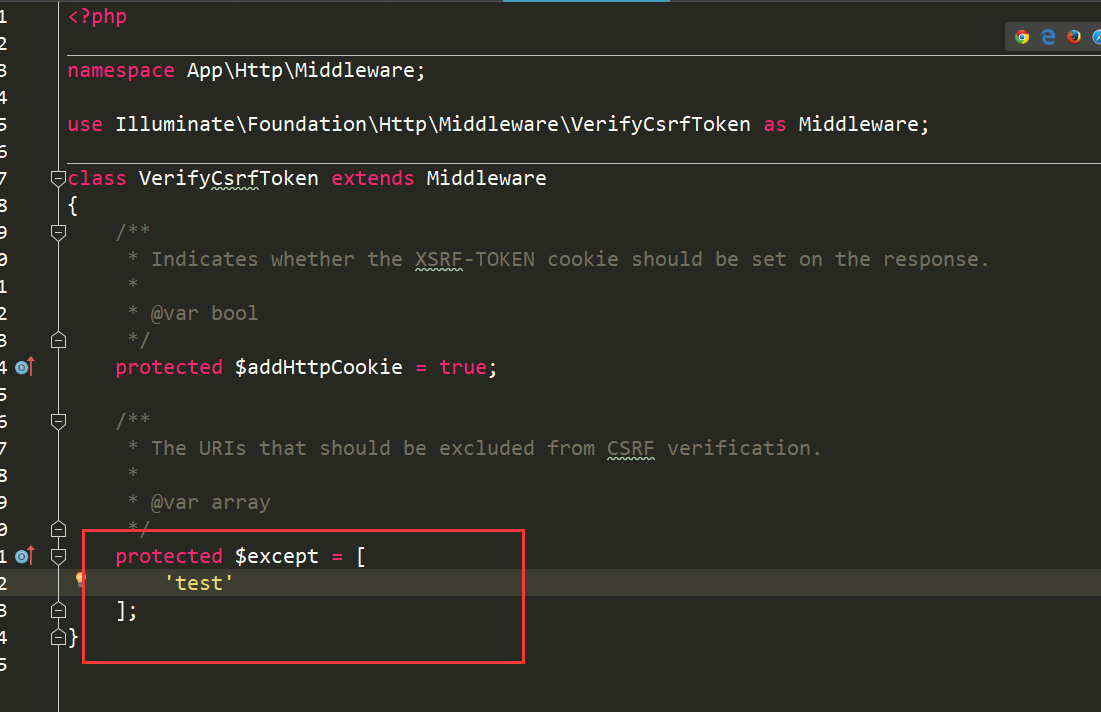 我们可以看看源码, VerifyCsrfToken这个中间件,我们加上我们刚刚设置的路由, 这个时候把模板的csrf删除依然是可以正常访问的