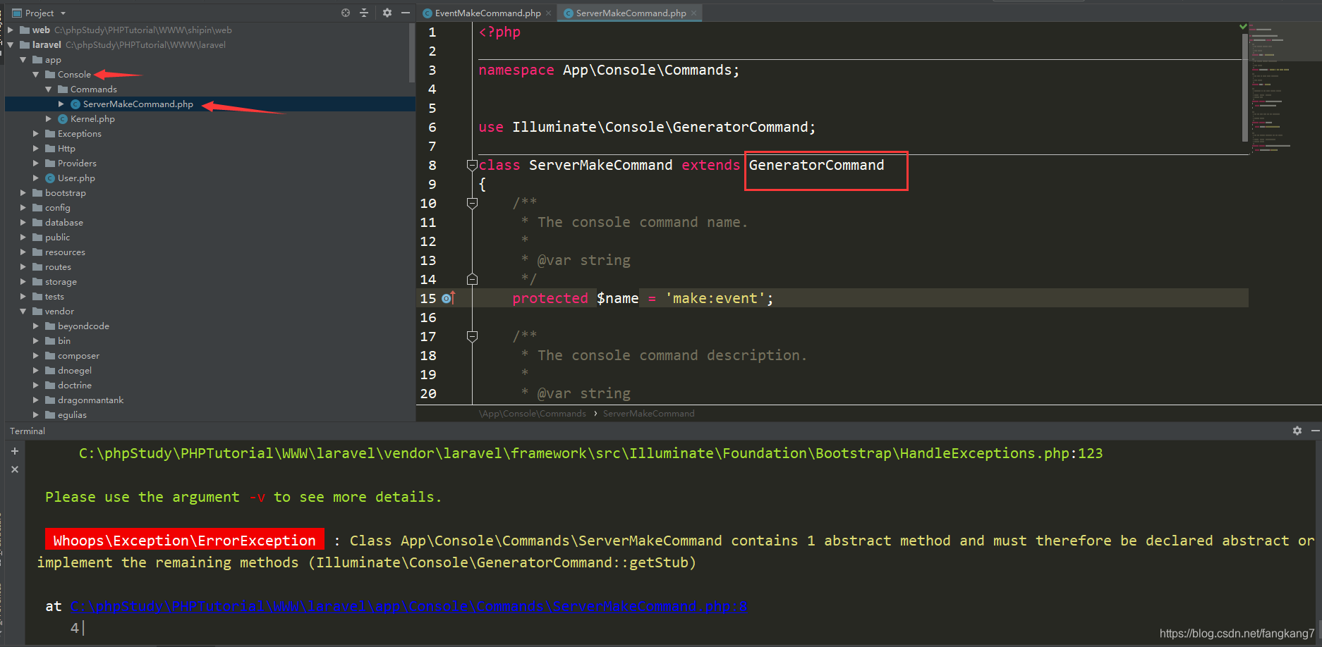 Whoops\Exception\ErrorException : Class App\Console\Commands\ServerMakeCommand contains 1 abstract method and must therefore be declared abstract or