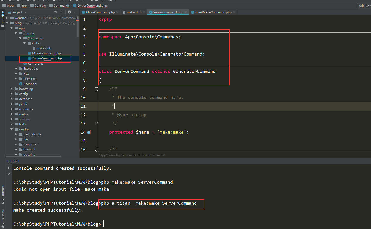 下来我们使用php artisan make:make ServerCommand来创建一个文件 ,然后把make:make改为make:server
