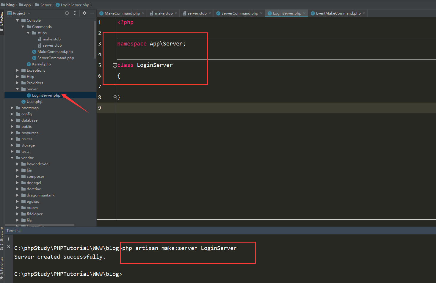 在我们的项目层级里边肯定有server层。这个时候我们可以直接调用命令php artisan make:server LoginServer命令来创建