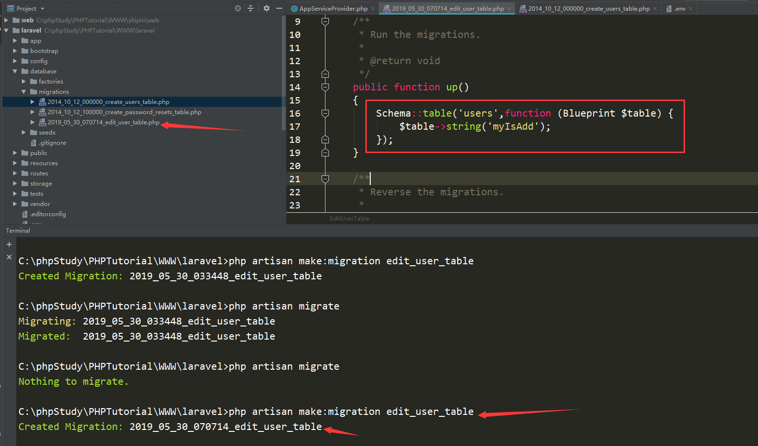 然后使用php artisan migrate命令执行