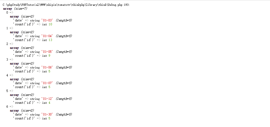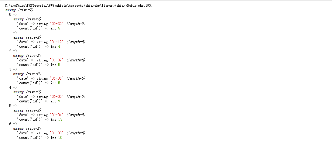 $result = Db::query("select FROM_UNIXTIME(time,'%m-%d')as date,count('id') FROM active_number GROUP BY time order by time desc limit 7");