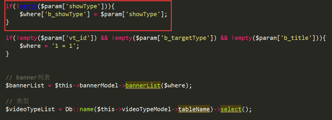 $bannerList = $this->bannerModel->bannerList($where);