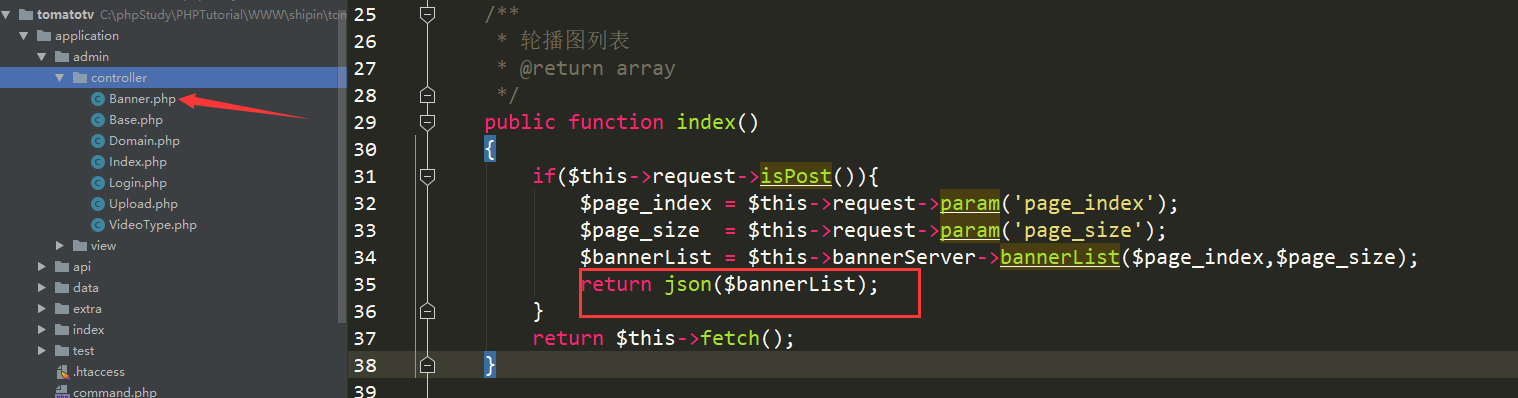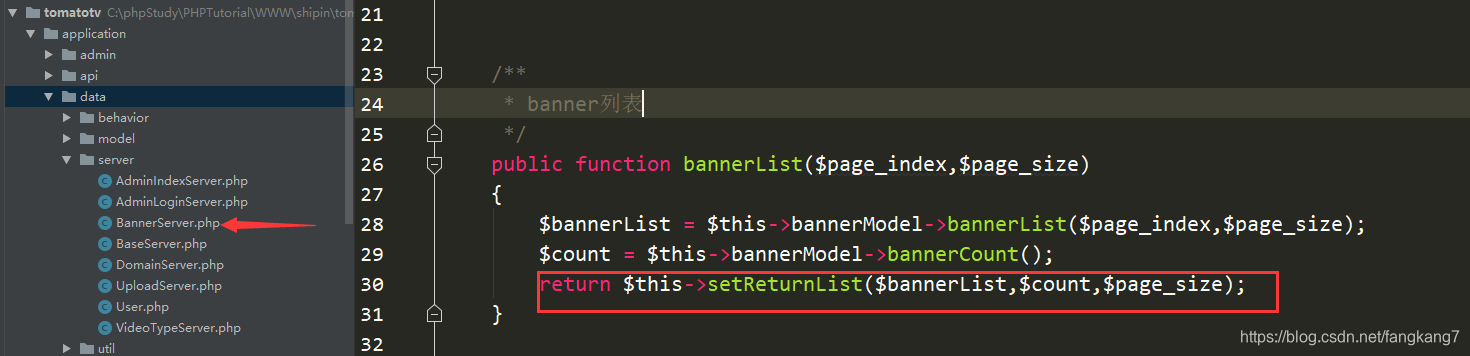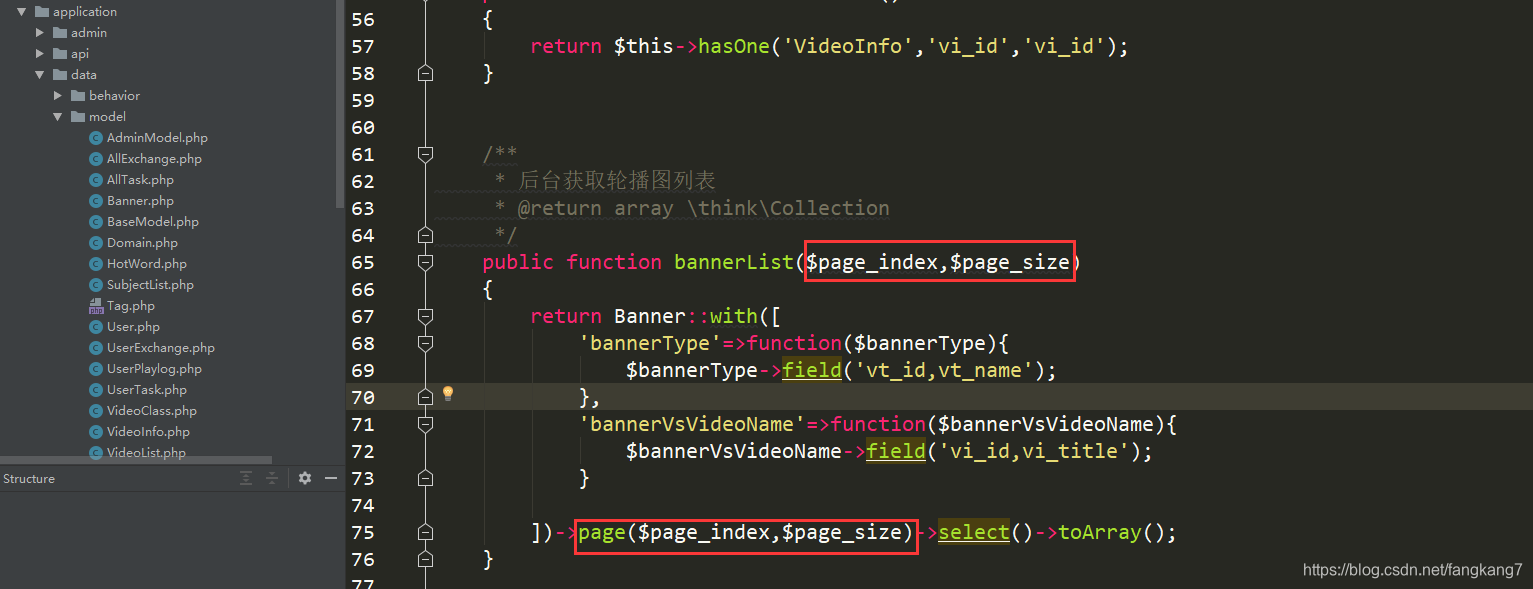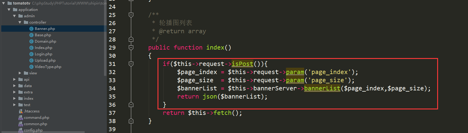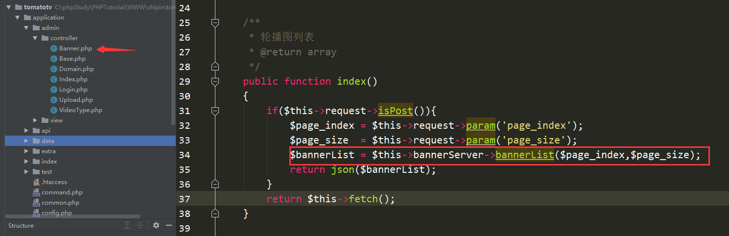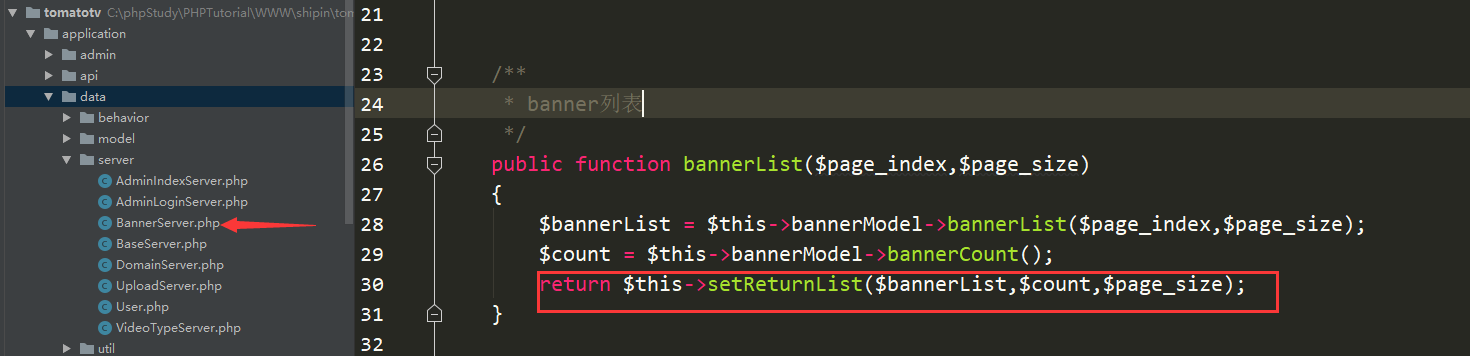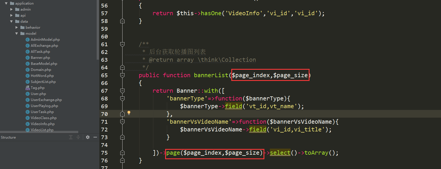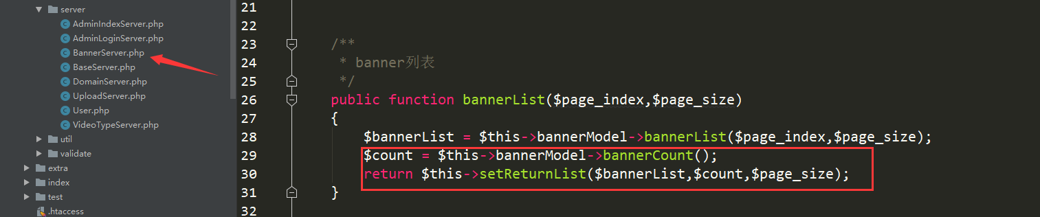 在bannerModel 里边获取列表的所有数据,这里边有一个关联预加载,这个是根据你们的业务来写的,如果没有其他业务直接获取全部然后page()->select()即可,model层数据处理完之后返回给bannerServer层