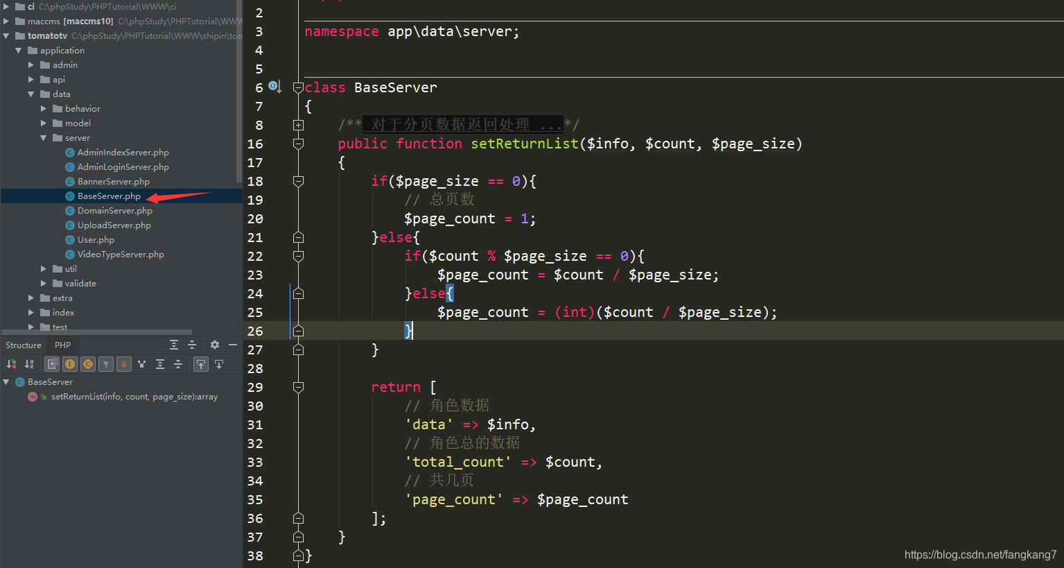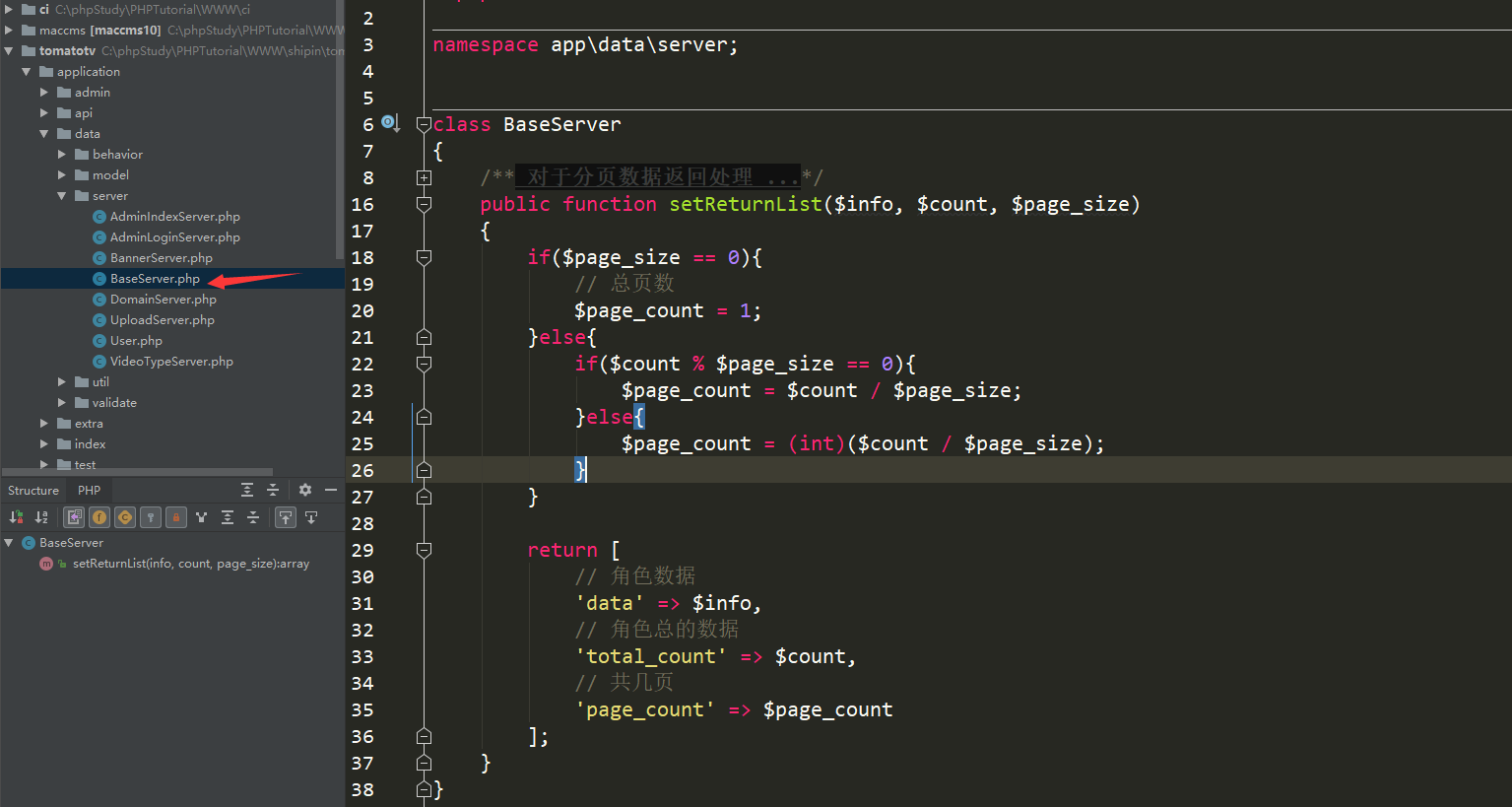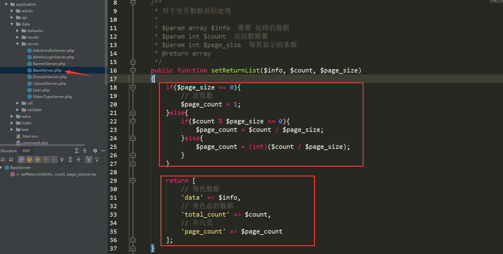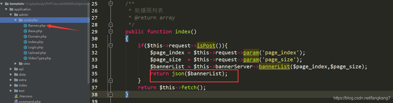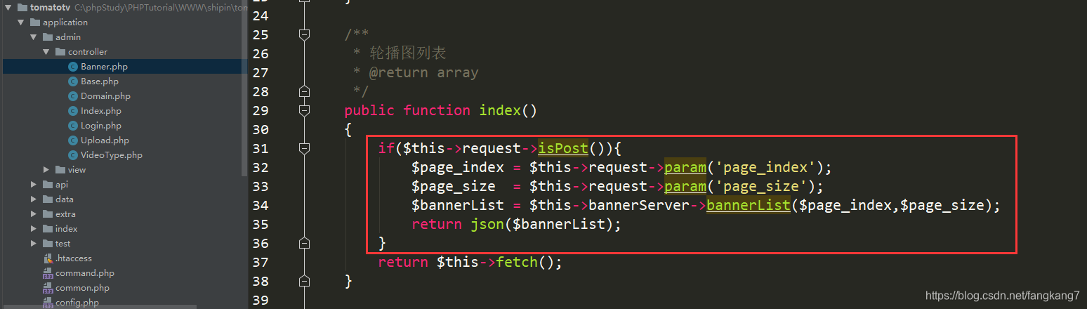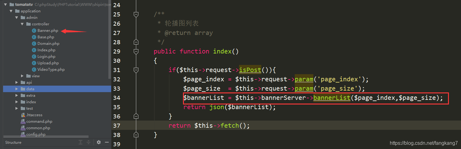 在bannerModel 里边获取列表的所有数据,这里边有一个关联预加载,这个是根据你们的业务来写的,如果没有其他业务直接获取全部然后page()->select()即可,model层数据处理完之后返回给bannerServer层