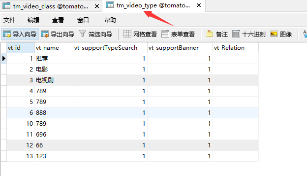 可以看到这份表的名字是tm_video_class这是一份视频分类表