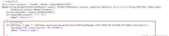 2.4 在后台代码里面,我们通过页面传入的token和已经产生的token session进行对比,如果两个相同,那么这些操作就认为是用户自己在操作,如果页面传入的和产生的token不相同那么这就是其他人员通过模拟用户进行了这样的操作,那么我们就要对它进行处理,让它跳转到登录页面。