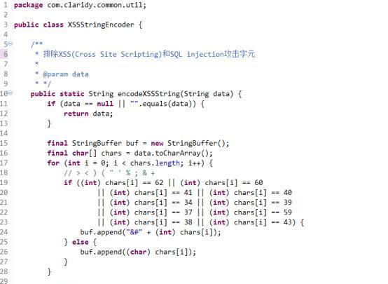 4.1 首先项目导入XSSStringEncoder.java,这个里面主要就是把传入字符串的特殊字符进行html转码,例如> < ) ( " ' % ; & +,这些特殊字符很有可能就是被注入的代码。