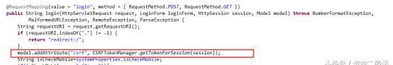 2.2 在用户进入项目,还没有跳转到登录页面之前,我们通过CSRFTokenManager代码产生一个token,然后把它传入登录页面,给它定义成csrf。