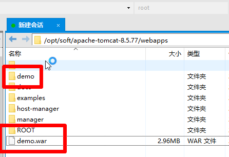 正确上传demo.war包到Tomcat的指定位置【apache-tomcat-8.5.77/webapps/】(5分)