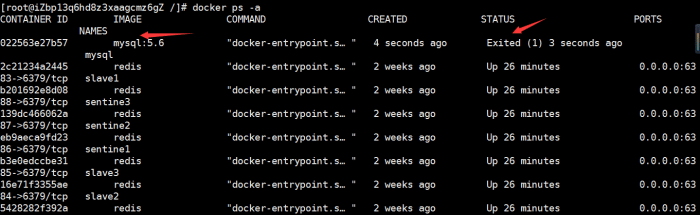会发现在创建成功后就直接给停止了,刚刚开始学习这些东西的小伙伴在这块估计会狠狠的折腾一番,因为在之前配置redis的主从复制就不会出现这样的情况,所以一时半会会摸不着问题出现在哪