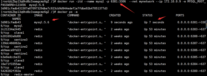 docker run -itd --name mysql -p 6381:3306 --net mynetwork --ip 172.10.0.9 -e MYSQL_ROOT_PASSWORD=123456 mysql:5.6