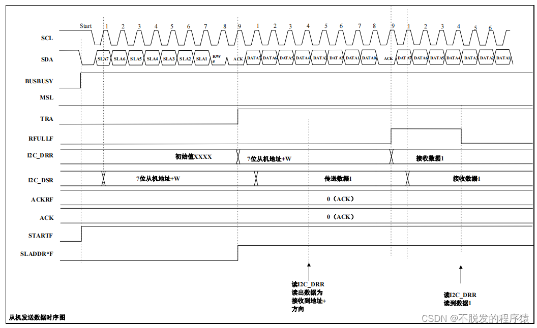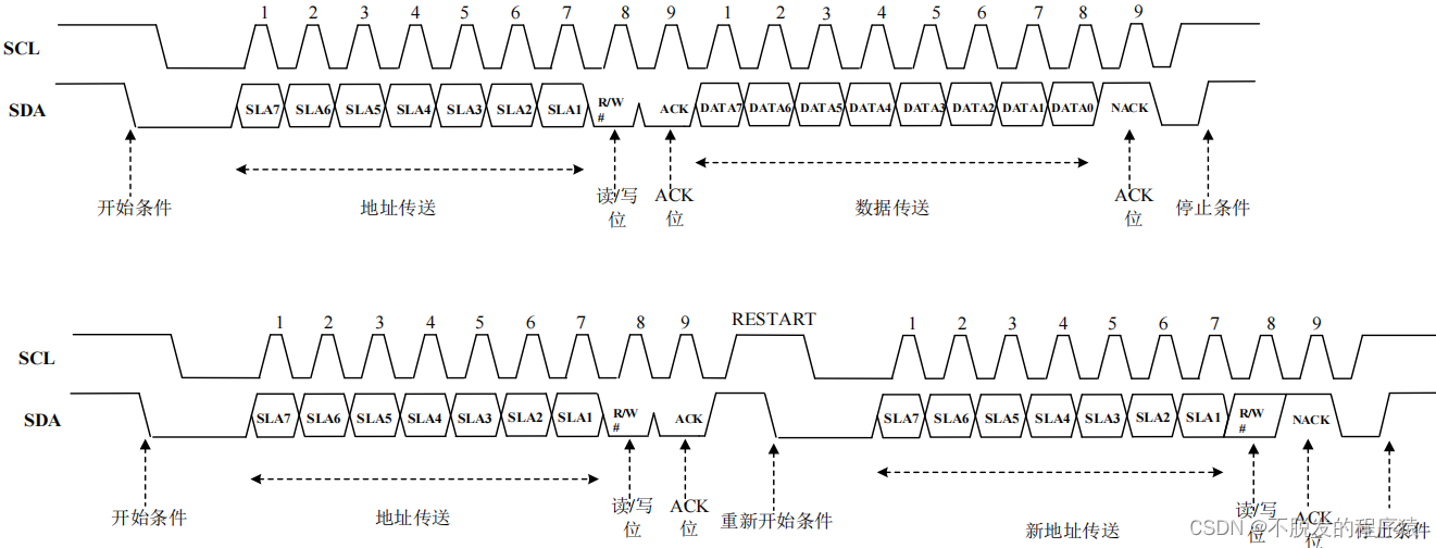 - R/W#:表示发送和接收的方向。当 R/W# 为“1” 时,将数据从从机发送到主机;当 R/W#为“0” 时,将数据从主机发送到从机;