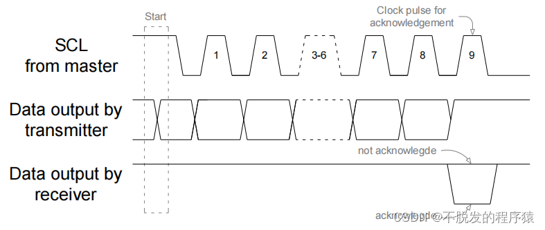 如果总线上从机接收数据,在第 9 个时钟周期不响应主机,从机必须发送 NACK。如果总线上主机接收数据,第 9 个周期发送 NACK,从机接收到 NACK,从机停止发送数据。