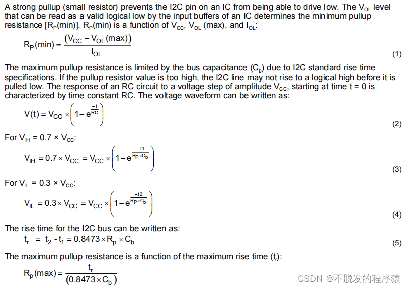 I2C 总线上拉电阻阻值取决于系统应用,TI 官方手册推荐使用以下公式来计算上拉电阻值: