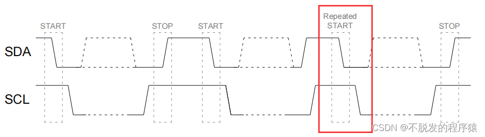 主设备通过将SDA线从高电平切换到低电平,再将SCL线从高电平切换到低电平,来向每个连接的从机发送启动条件,如下图所示: