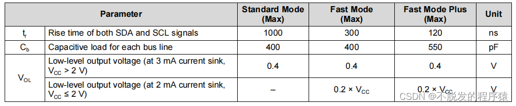 所以根据上述公式可以计算,对于5V的电源,每个上拉电阻阻值至少1.53kΩ,而对于3.3V的电源,每个电阻阻值至少967Ω。
