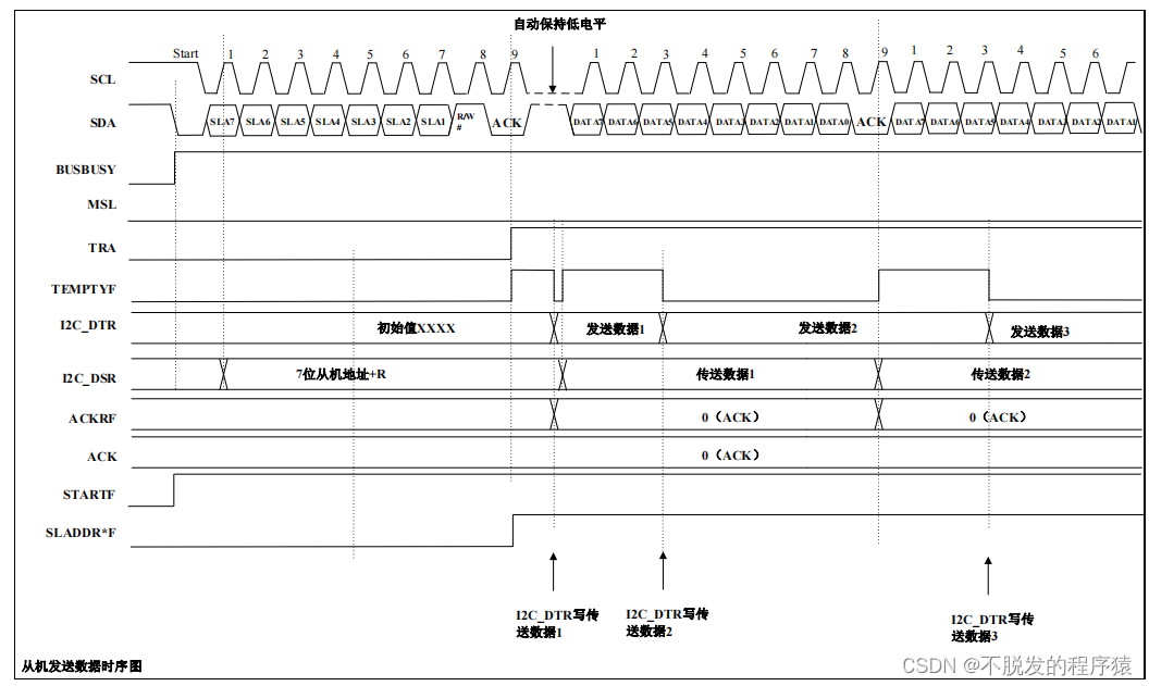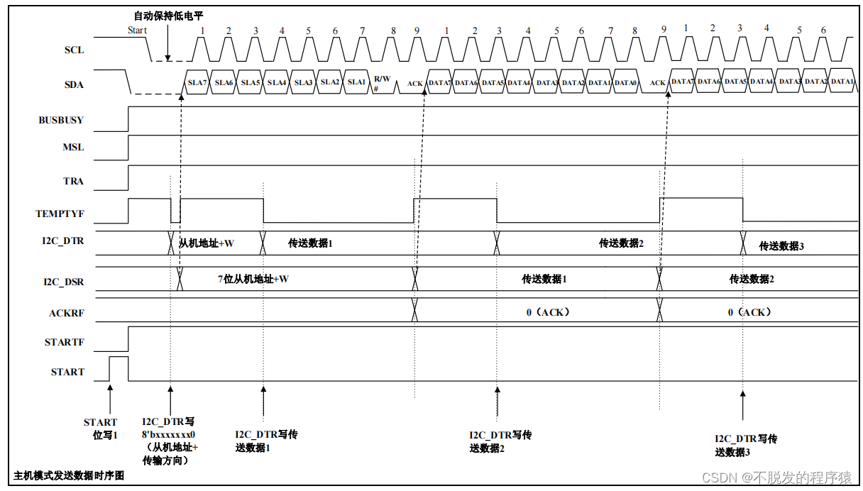 主机在 SCL 线上输出串行时钟信号,数据在 SDA 线上进行传输,每传输一个字节(最高位 MSB 开始传输)后面跟随一个应答位,一个 SCL 时钟脉冲传输一个数据位。