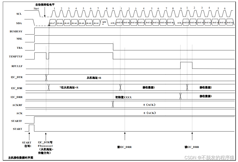 在主机接收模式中,主机输出 SCL 时钟,接收从机数据并返回应答。主机接收数据的运行时序例如下图所示: