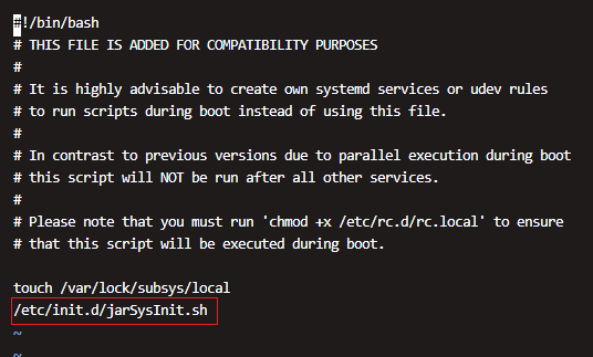 解决办法:再添加一个文件,让系统的加载文件(/etc/rc.d/rc.local)执行降权的文件A,让降权文件A执行去执行启动Jar包的脚本(/etc/init.d/jarSysInit.sh)