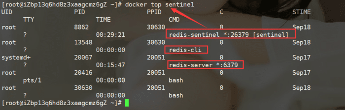 这里是查看了一个哨兵的容器,然后可以看到里边有三个进程,那么如果你在测试哨兵配置是否成功时,就可以使用top指令来查看容器的进程,然后使用kill直接干掉就可以达到预期效果