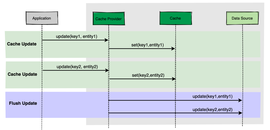 - 一种是收集所有写入操作,然后在某个时间点(例如,当 DB 负载较低时)对数据源进行批量写入。
