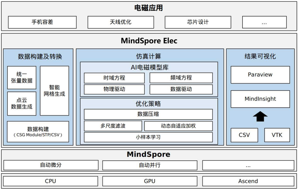 MindSpore Elec内置有前后处理工具(数据构建及转换、结果可视化)、AI电磁模型库(物理方程驱动和标签数据驱动)以及优化策略(数据压缩、动态自适应加权等),具体模块和功能如下: