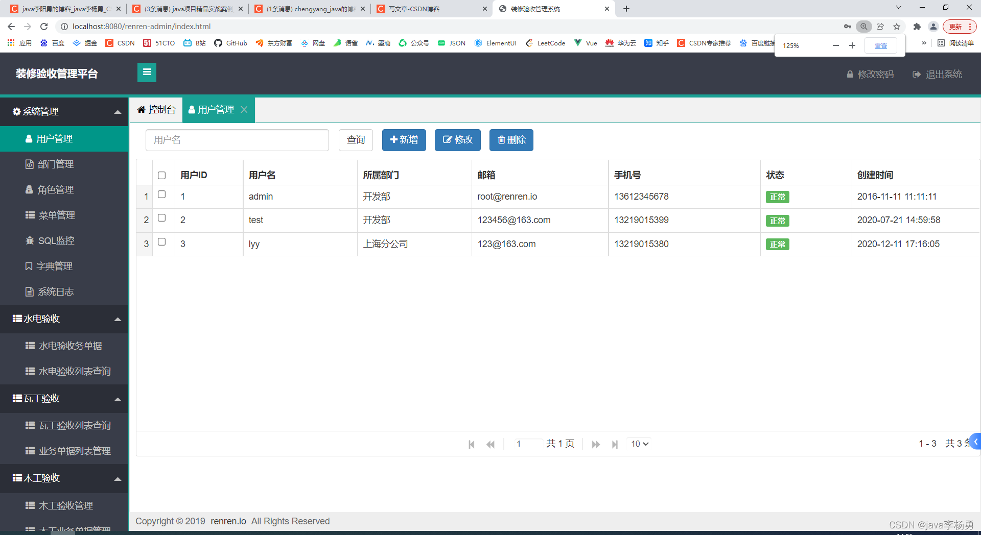 随着社会的进步和科技的发展,越来越多的人追求新颖独特,实用的居住和工作学习环境。因此,在如今的建筑装饰工程中,既要考虑到客户的需求和与建筑结构的协调统一又要考虑到成本和施工组织的安排,所以说现代装饰工程是一件相对繁琐却又必须要做好的事情。在保质保量完成工作内容的同时,还要确保施工施工验收的各项标准数据、通过一段时间对Java相关开发知识的学习,基本了解了施工过程中的各种工艺流程和特点,利用JavaSpringboot+layui简单做个一个装修验收管理系统、适用于简单学习参考使用。