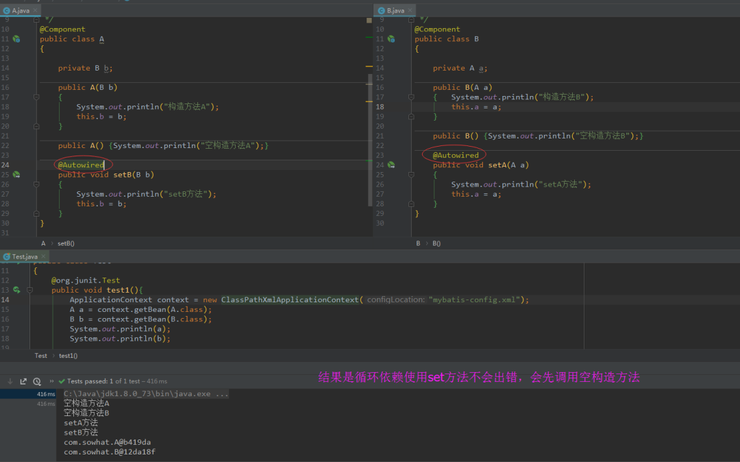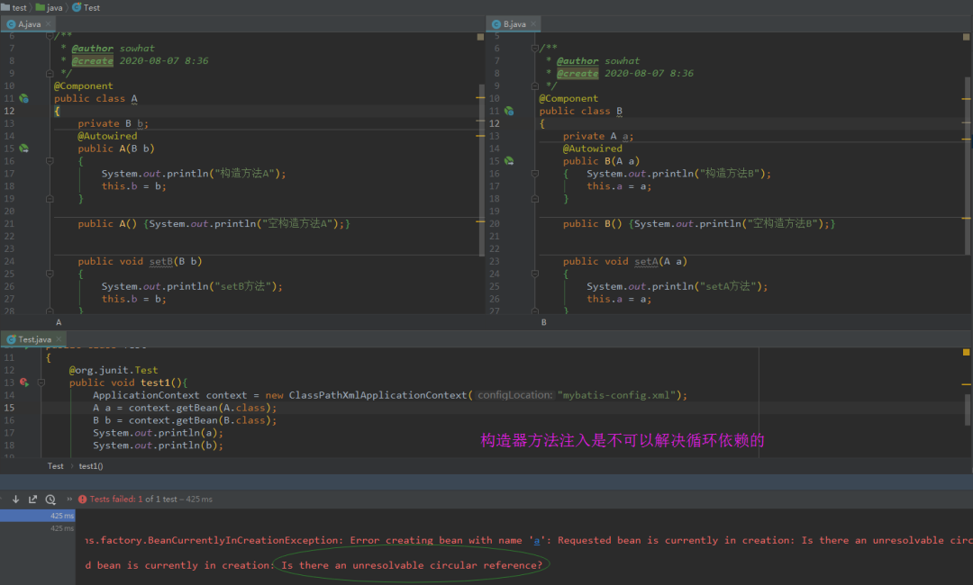 从上面的测试结果我们可以看到,不是只有在setter方法注入的情况下循环依赖才能被解决,即使存在构造器注入的场景下,循环依赖依然被可以被正常处理掉。