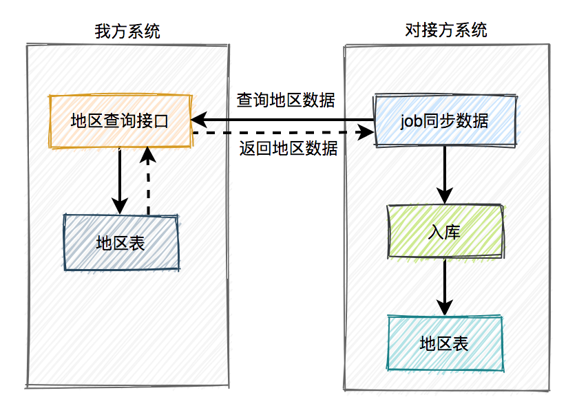那次会议当中,我们这边的几位同事,短暂的讨论了一下。既然对接方不愿意接受在他们本地持久化地区表,我们就退而求其次,不要求他们持久化了。这时我们这边有个同事提出,改成按名称调用地区查询接口,反查出地区id,具体方案如下:
