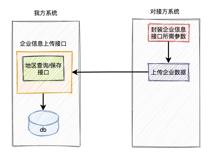 我当天晚上思考了良久,第二天早上,发现跟我们老大的想法不谋而合。得出的结论是,既然存在差异化,没办法避免,我们就要从系统设计上接受差异化。在企业信息上传接口中增加两个字段:企业注册地国标码 和 地区名称,对接方改成传入这两个字段,具体方案如下: