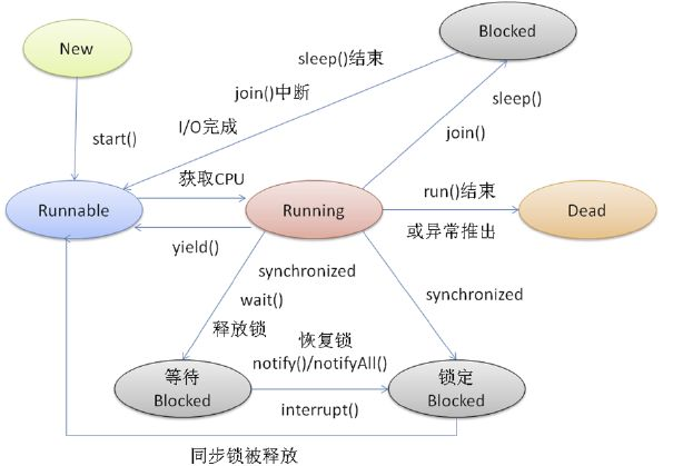 1、新建状态(New):新创建了一个线程对象。2、就绪状态(Runnable):线程对象创建后,其他线程调用了该对象的start()方法。该状态的线程位于可运行线程池中,变得可运行,等待获取CPU的使用权。3、运行状态(Running):就绪状态的线程获取了CPU,执行程序代码。4、阻塞状态(Blocked):阻塞状态是线程因为某种原因放弃CPU使用权,暂时停止运行。直到线程进入就绪状态,才有机会转到运行状态。阻塞的情况分三种:(一)、等待阻塞:运行的线程执行wait()方法,JVM会把该线程放入等待池中。(wait会释放持有的锁)(二)、同步阻塞:运行的线程在获取对象的同步锁时,若该同步锁被别的线程占用,则JVM会把该线程放入锁池中。(三)、其他阻塞:运行的线程执行sleep()或join()方法,或者发出了I/O请求时,JVM会把该线程置为阻塞状态。当sleep()状态超时、join()等待线程终止或者超时、或者I/O处理完毕时,线程重新转入就绪状态。(注意,sleep是不会释放持有的锁)5、死亡状态(Dead):线程执行完了或者因异常退出了run()方法,该线程结束生命周期。